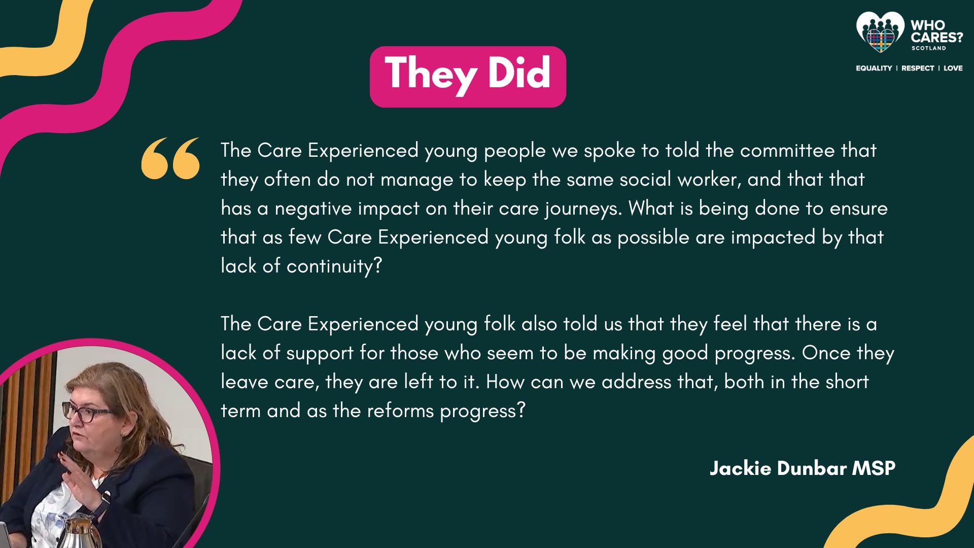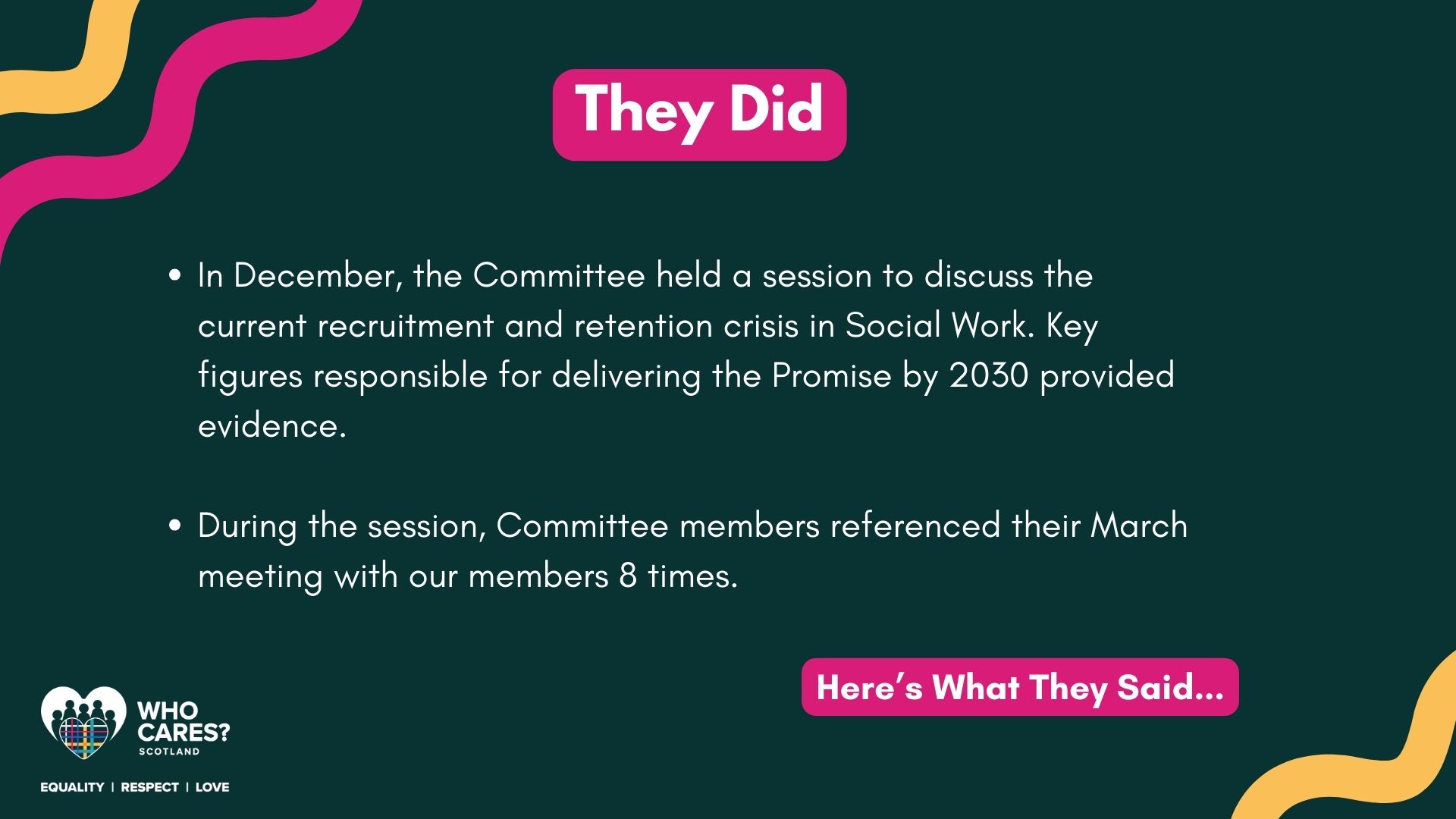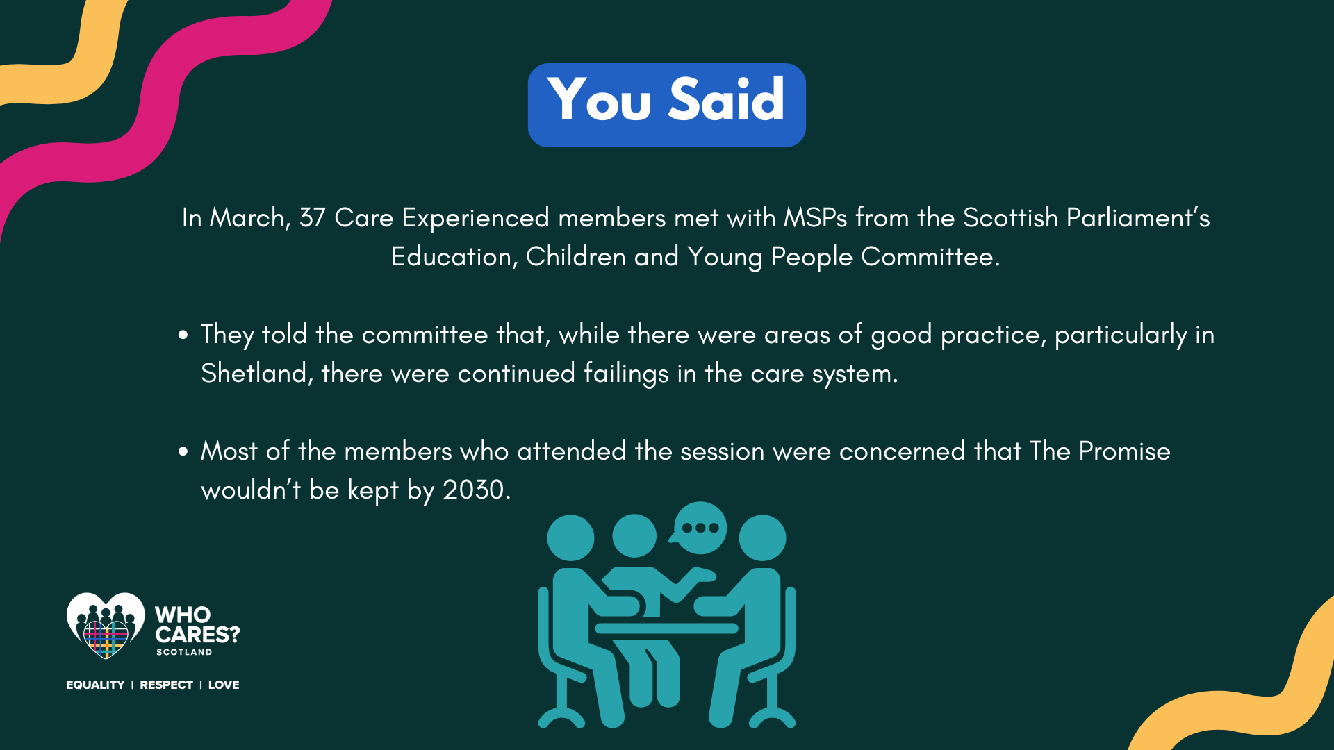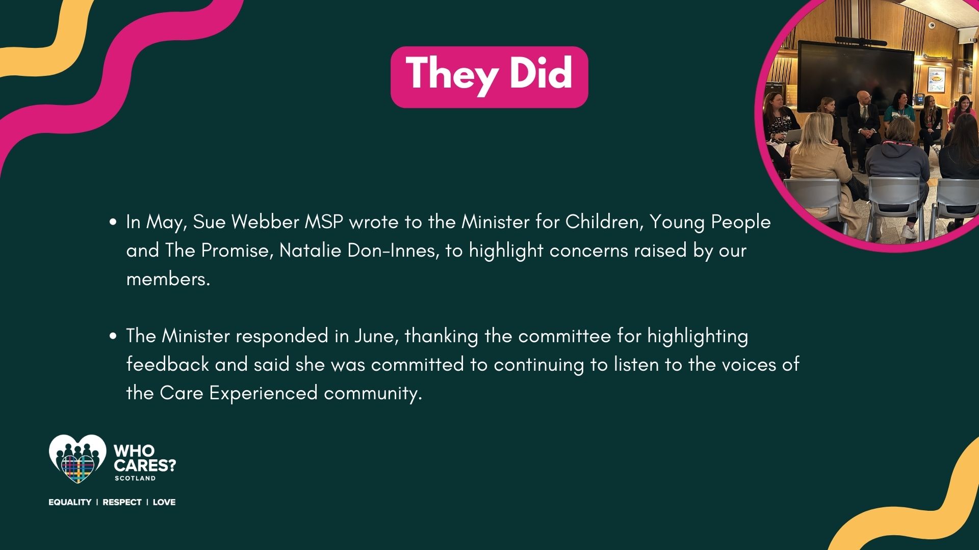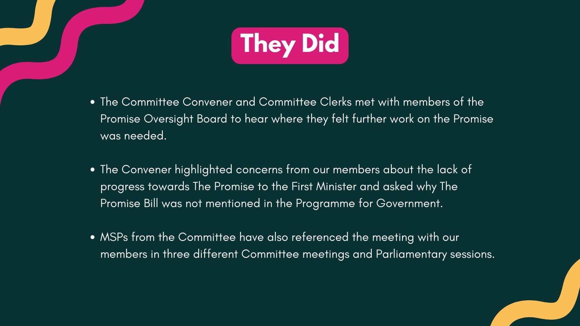 Over the past few months, the MSPs involved in the Committee have used the feedback provided by our members to influence discussions and meet with other organisations to discuss The Promise.