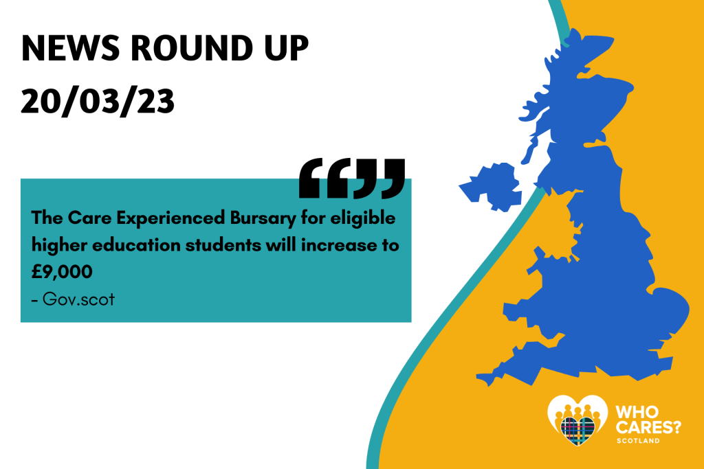 - The annual non-repayable Care Experienced Bursary for eligible higher education students will also increase to £9,000 – https://www.gov.scot/news/increased-support-for-students/